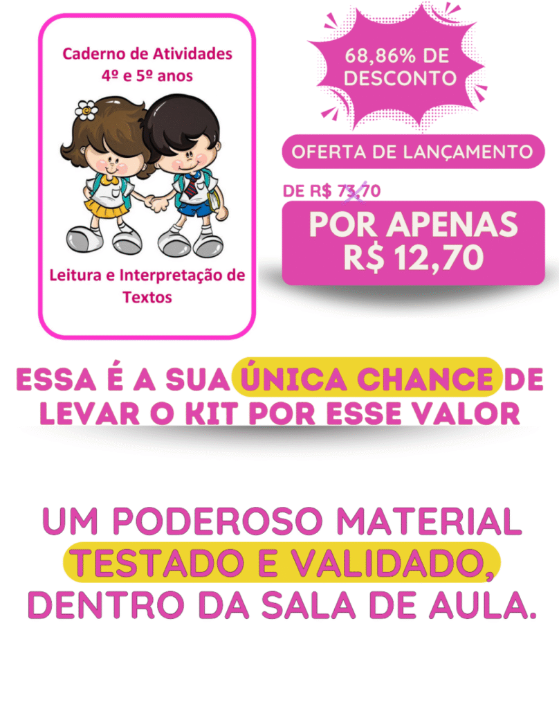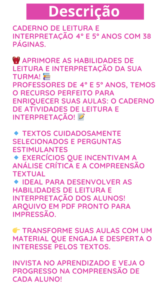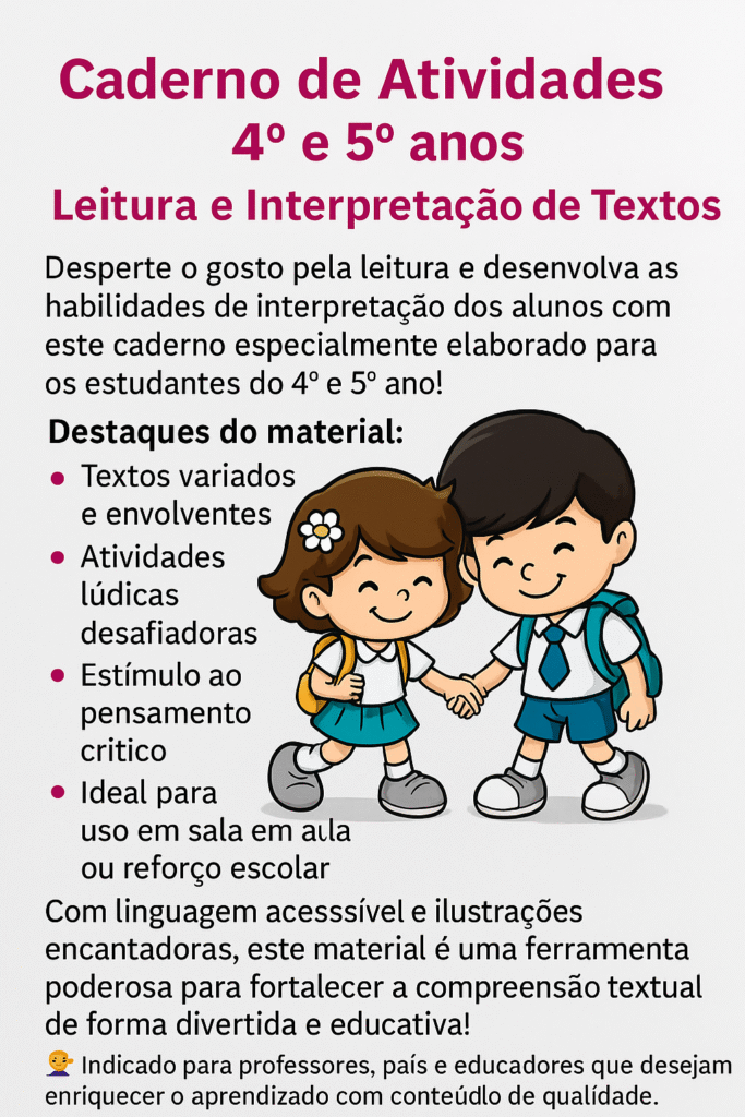 O caderno foi desenvolvido especialmente para crianças de 4 a 5 anos, respeitando o ritmo e o nível de aprendizagem dessa faixa etária. As atividades são lúdicas, educativas e estimulam o gosto pela leitura desde cedo.